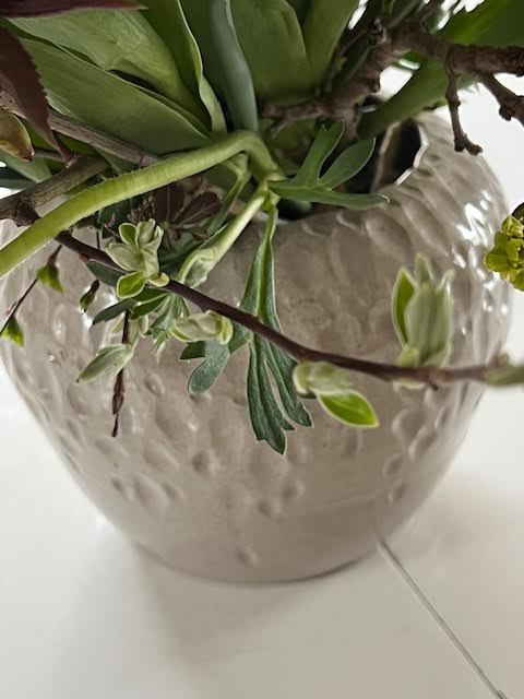 Drejad i återvunnen lera. Skiftar i färg från gång till gång. Gråbeige.